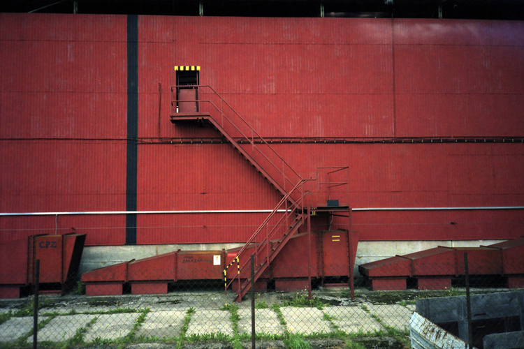 podivny vchod v strede cervenej steny, potrubie, aj ta betonova cesta