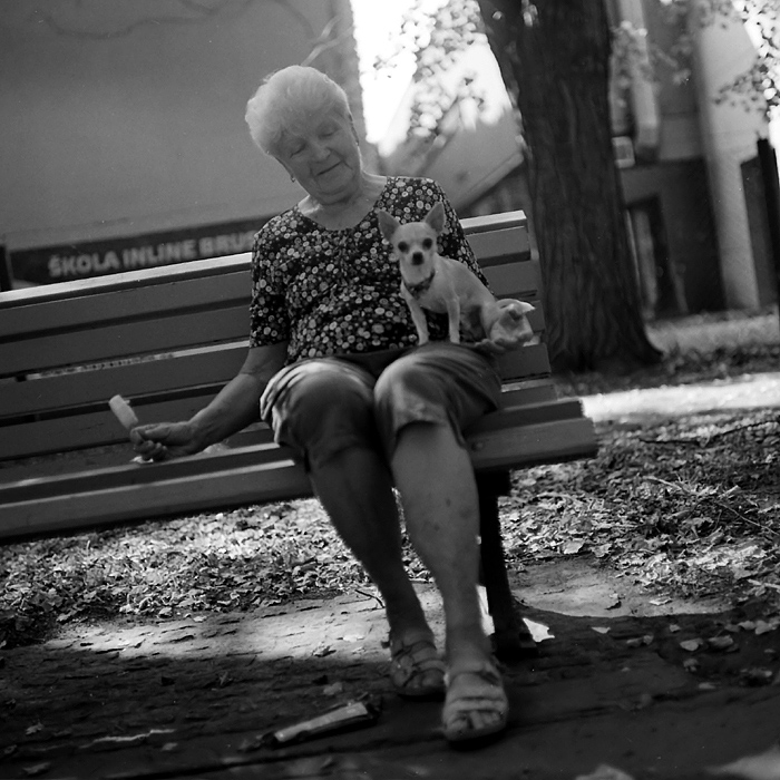 Neznáma pani na lavičke v parku so psíkom, a s nanukom v ruke...