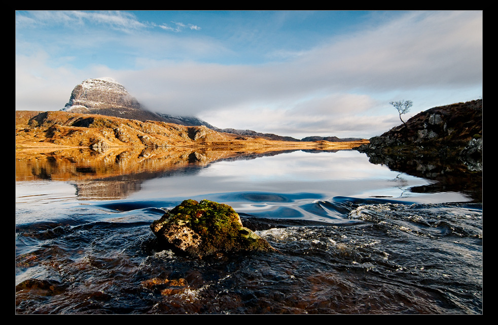 Jezero Fionn Loch, kousek za vodopádem Falls of Kirkaig, nedaleko Lochinveru. V pozadí Suilven.