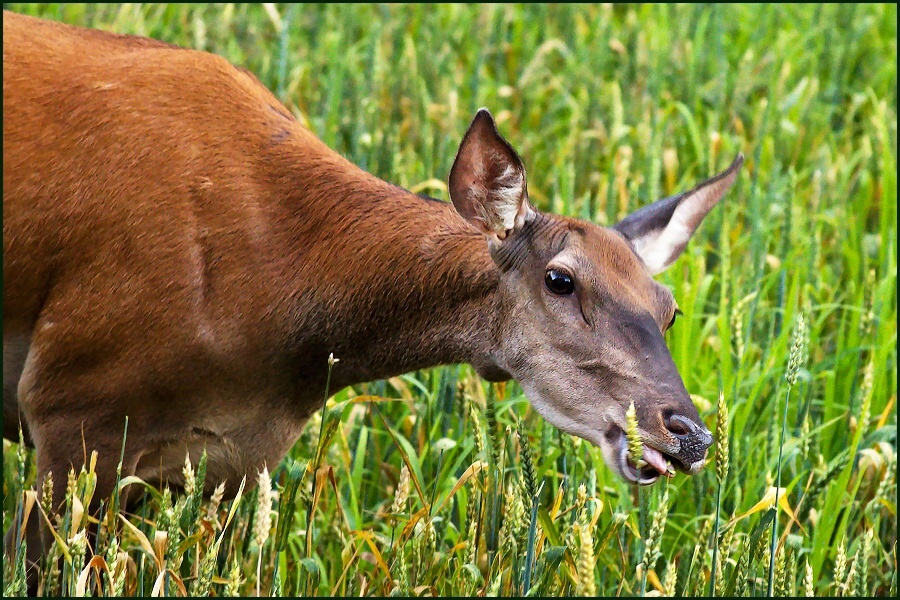 Letos 6. července jsem seděl na nízkém posedu, asi tři metry nad zemí, abych zjistil pohyb srnčí zvěře před říjí. Neměl jsem příznivý vítr, vanul směrem k lesu vzdálenému asi třicet metrů, odkud jsem očekával příchod zvěře. Ve třičtvrti na devět večer jsem najednou uviděl vyjít laň s kolouchem. Na jelení zvěř to byl příchod dost brzy, většinou vychází až za velkého šera. Přišli blízko, měl jsem radost. Až jsem se obával, že mě navětří. S podivem ani cvakání závěrky, až na počáteční stisk, jí nevadil. Jak přišli, tak brzy odešli zpět do lesa. Něco se lani nezdálo. Za půl hodiny jsem již věděl, co je vyrušilo. Z lesa se ozýval kvikot, chrochtání a mlaskání. Bylo již velké šero, když vyšla vodící bachyně. Za ní několik lončáků a potom i šest pruhovaných markazínů. Jak si pochutnávali na klasech ! Uchopili klas a zrno z něj úplně sedřeli ... Mlaskot nebral konce. Druhý den jsem akci zopakoval, situace s divočáky se opakovala. Přešli mi těsně pod posedem. To byla podívaná ! Ale fotografovat