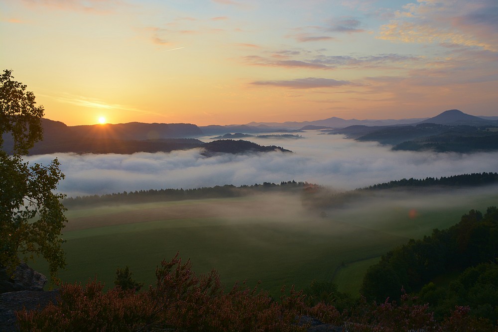 pohled z německé vyhlídky Zirkelstein nad vesnicí Schona. Dole pod mlhou kaňon Labe. úplně vlevo za břízou vyhlídka kipphorn Německo, nejvyšší hora v pravo Růžový vrch Česká republika. čas 6:23