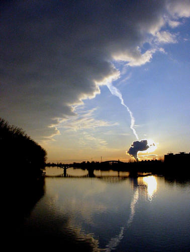 Malý "mrak" je para z chladiacich veží atomovej elektrárne, ten spoj je stopa po lietadle a to velké to sa na nás valila zmena počasia :-), ale búrka z toho nebola.