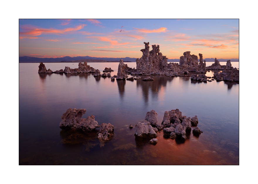 ...více než 700 000 let staré prajezero bez odtoku. Ještě před 70 lety vypadalo Mono Lake úplně jinak. Bylo asi dvakrát větší a po vápencových útvarech (tufy) nikde ani stopy. Avšak v roce 1941 tady byl postaven akvadukt a z jezerních přítoků se začala odčerpávat pitná voda pro Los Angeles. Hladina jezera začala rapidně klesat. Za 50 let klesla o dvanáct metrů, objem vody se snížil na polovinu. Postupně se tak odhalily tufové věže. Kvůli úbytku vody je jezero přibližně 2,5-krát slanější než moře, voda má pH 10 a je mýdlově kluzká.