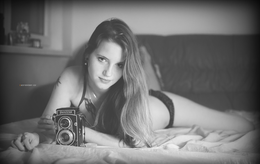 skoro svlečená na posteli foťák nedrží ani v jedné ruce ale má ho na krku asi aby náhodou z postele nespadl