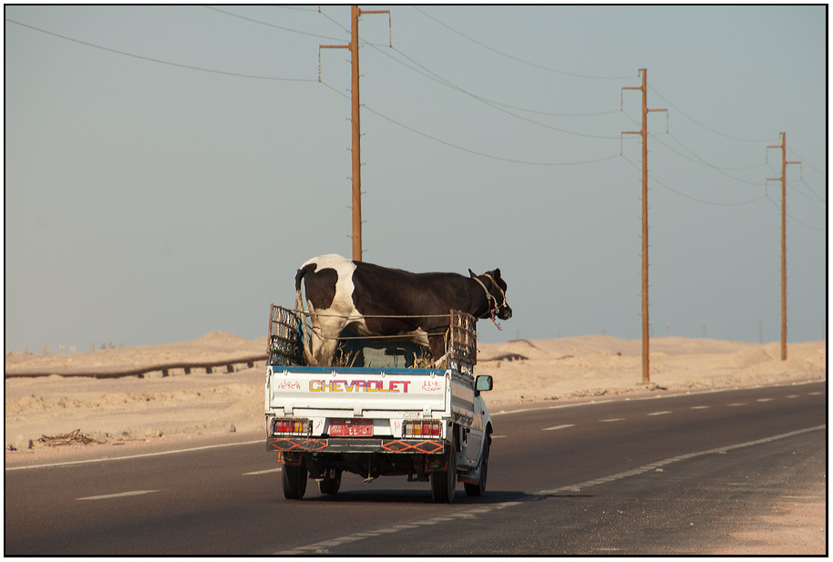 Měl jsem tu fotku dát do nějaké kategorie (reportáž), pak bych se možná vyhnul některým zdejším komentářům. Ono není jednoduché vidět krávu ve zpětném zrcátku, zastavit, vzít foťák a zdokumentovat to. Tolik času nebylo a abych se předháněl s tímto objektem a hledal vhodné místo, abych uspokojil místní estetické nároky... Ona ta kráva původně seděla na korbě a prohlížela si v laptopu příspěvky zdejších autorů. No a než jsem zastavil, tak holt vstala a takhle to dopadlo...