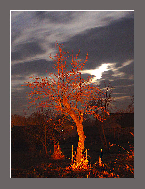 Osvětlené taborákem. Nešlo umístit mimo střed, protože překážely stromy.