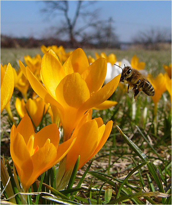 Volil bych záběr víc seshora, strom v pozadí není v souvislosti a ruší. Navíc by se květ přestal překrývat s ostatními. Buď daleko menší hloubku ostrosti nebo nadhled. Taky je škoda, že včele chybí malý kousíček, schovaný za květem. Buď víc nebo vůbec.