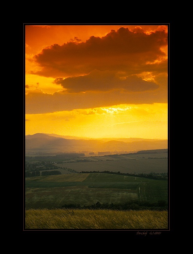Pohled na pole zalité západem slunce :) Chybí jen dělník, kterému se k oku leskne slza z pocitu štěstí z dobře vykonaného plánu.