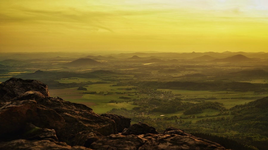 Výhled z vrcholku Ještědu při začínajícím západu slunce.