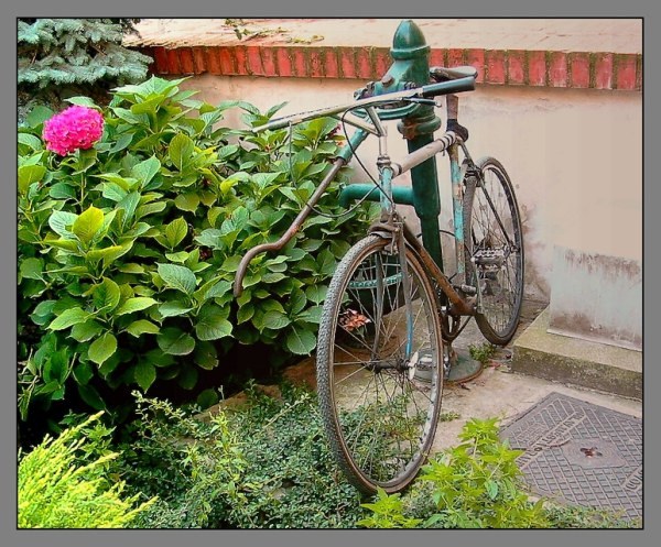 Bicykl není vložen později,foceno přes plot v jedné zahrádce.Právě ten chaos všech předmětů se mi zalíbil a z toho důvodu jsem to vyfotil.