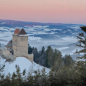 Kašperk před východem s růžovou oblohou, pak se nasvítila první věž a barva se změnila ve zlatou až je Kašperk celý ze zlata...
