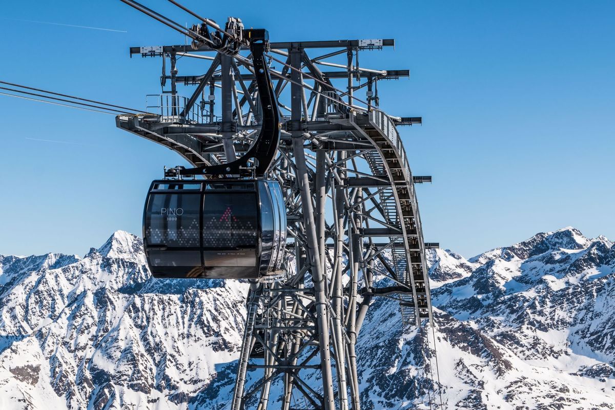 Kabinka lanovky v Söldenu jedoucí k instalaci ELEMENTS 007 ve výšce 3048 m.n.m., která návštěvníky provází natáčením posední natočené bondovky Spectre, která se z části točila právě v této oblasti.