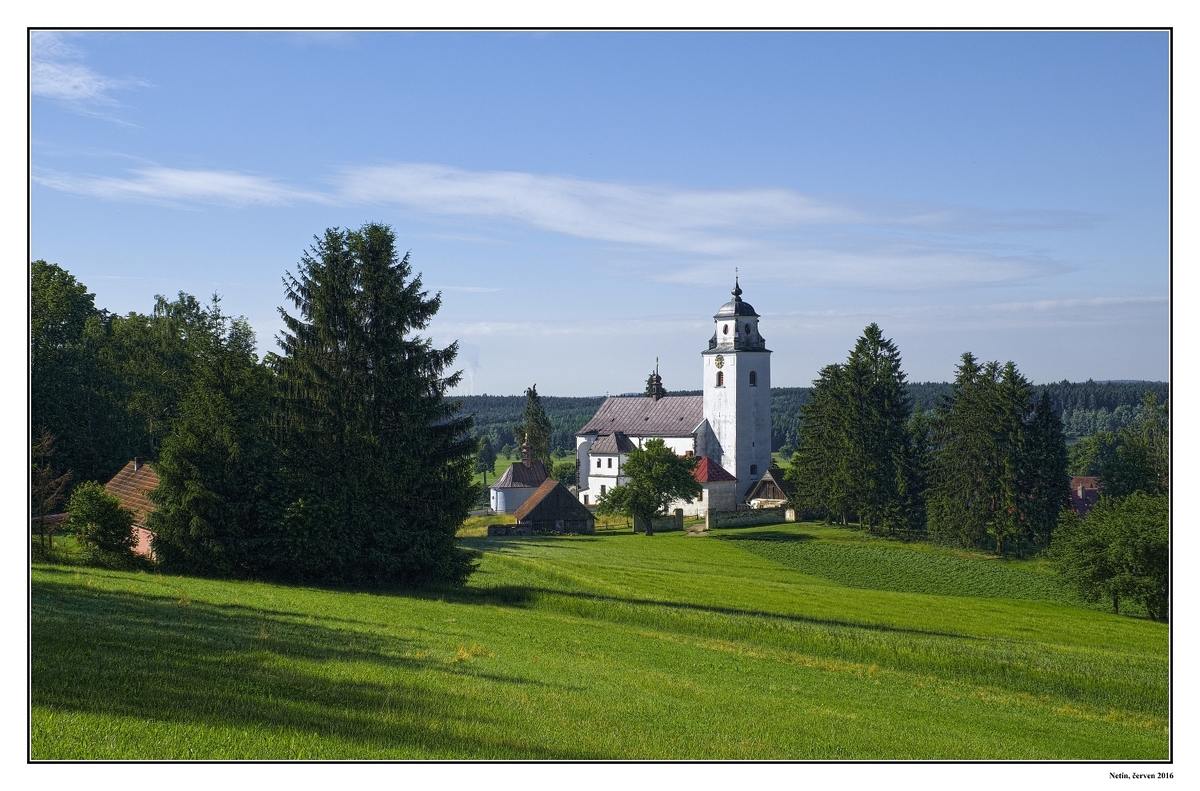 Jistě máš pravdu. Architekturu fotit neumím, ani se o to nesnažím. Ale lidovou či sakrální stavbu pěkně a citlivě zasazenou do přírody rád vyfotím. Netínský kostel takovou scénu ze severozápadní strany nabízí.