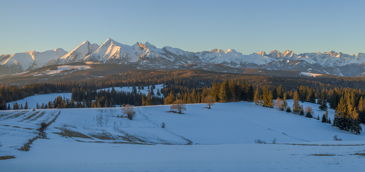 Dominantní jsou hlavní vrcholy východních tater, nicméně v pozadí nasvětlené Rysy, Mengusovské štíty, Gerlach atd.