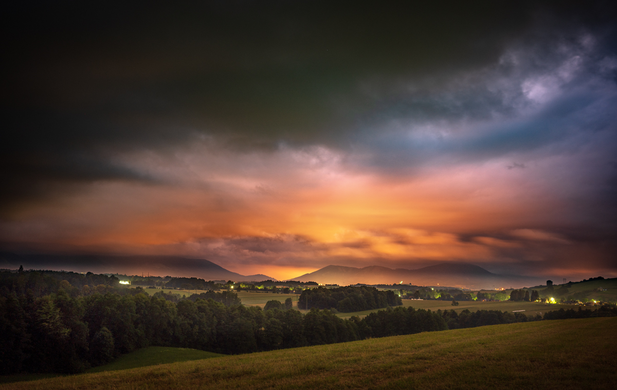 Kombinace světla blesků a umělého osvětlení, v pozadí Moravskoslezské Beskydy