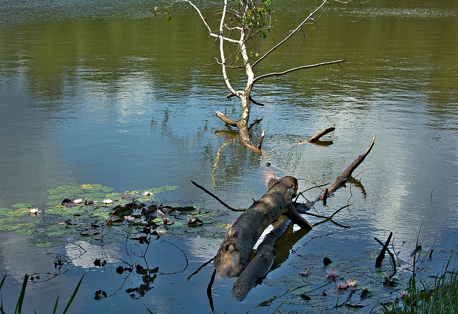 snímek klády na vodě s lekníny