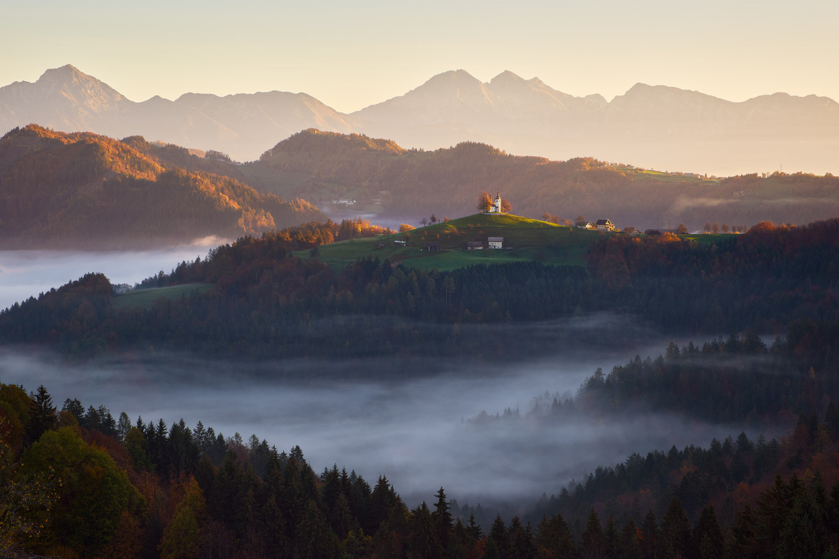 Díky. Ačkoli se to nezdá, tak tahle scéna, pokud nefotíte pouze kostel vyloženě dlouhým ohniskem, je kompozičně docela náročná. Doleva jsem záměrně nešel, aby se příliš nepřiblížily nebo dokonce neprotnuly sbíhající se linie kopců. A ořezem zprava bych zase přišel o jemné zakončení mlžných cárů mezi stromy :).
