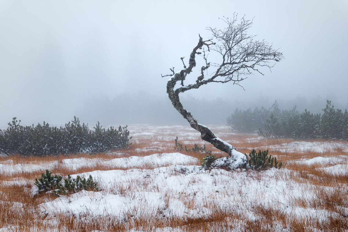 Na první pohled Šumava. Břízka má dramatický tvar.