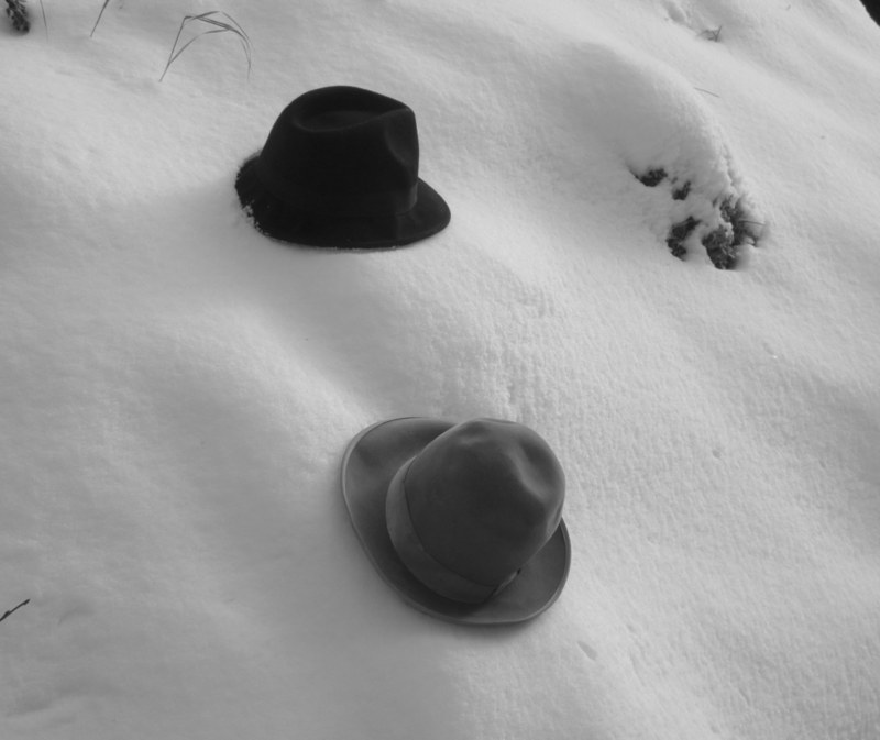 Vítr odfouknul klobouky do sněhu. Škoda, že ten černý není ostrý.