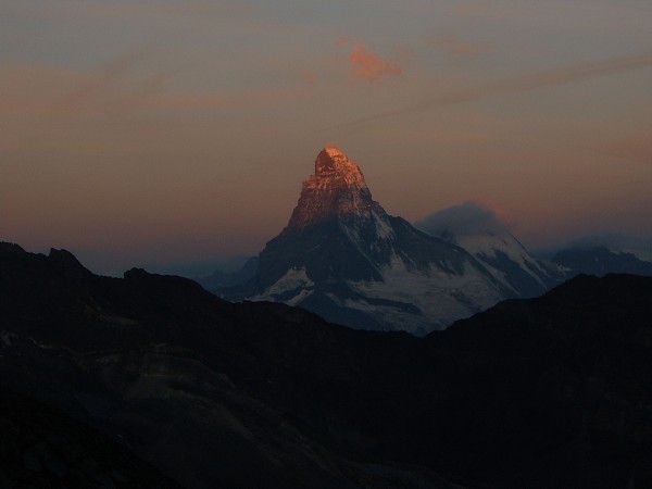 Tato hora byl náš původní cíl. Vzhledem k tomu, že v Alpincentru nám oznámili, že jsou ve stěně špatné podmínky a že příštích pár dní nebude hezky, že nám nejsou schopni říct, kdy se to zlepší, jsme se rozhodli pro horu jinou, lehčí. Tohle je pohled z výstupu na onu horu "náhradní" .. Tak takhle si představovali špatné počasí a nelezitelné podmínky !!! Bylo to až k vzteku! Vylézt na Matterhorn je totiž snem každého horolezce.