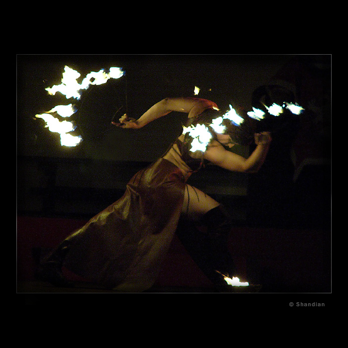 Dívka focena v pohybu v noci a z dálky, šum a "neostrost" proto neřešte. "Vypálené" fleky jsou ohně, s nimiž slečna velmi obratně točila