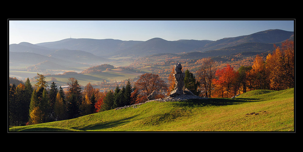 Moc pěkné podzimní barvy a zvlněná krajinka v popředí i v pozadí... Snad jen trochu škoda té levé strany (hlavně oblohy) - ostré slunce už tam tomu dalo docela zabrat... Jinak líbí, pěkná krajinka...