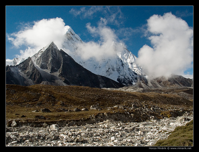 Ama Dablam je vysoká 6812 m. Je to dvouvrcholová hora, která po několik dní dominuje výhledu všech, kdo cestují k Mount Everestu. Na této fotografii je ale netradičně z druhé strany, z údolí Chukung (4750 m.n.m.).