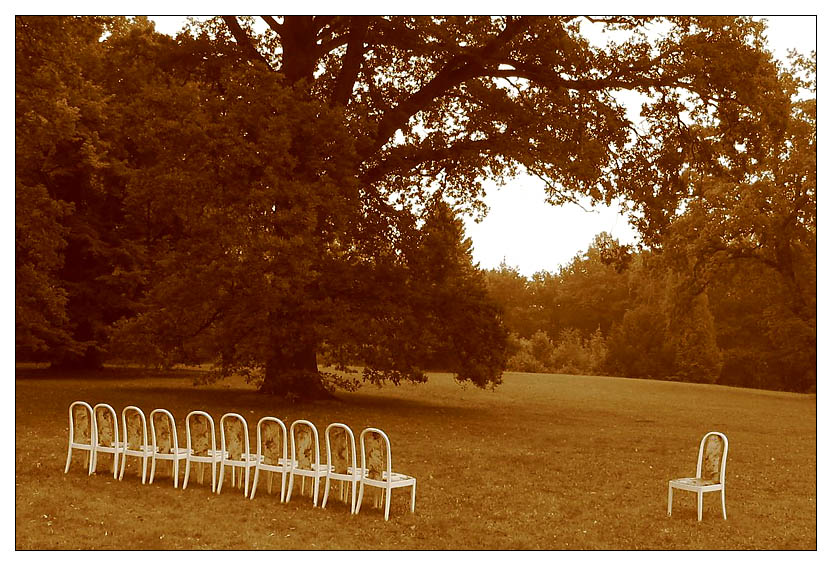 Moment z jedné svatby. Převod do sépie měl zvýraznit ty židle proti trávě. Předem díky za konstruktivní komentáře.