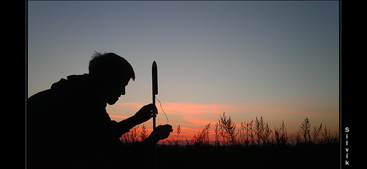 Příprava rakety vlastní konstrukce k odpalu. Tah motoru cca 100N hmotnost 160g.