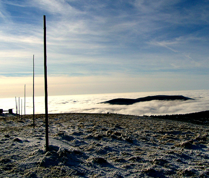 Krásný dokumentační snímek inverze z výstupu na Praděd (typuji 16.11.2003), škoda, že jsi to nefotil tak asi o dvě hodiny dříve, aby ti tam nelezlo tolik to slunce . Na rovnost tyčí bych se neohlížel, zkoušel jsem je použít jako opěrku pro foťák a silně jsem pohořel, dle Dlouhých Strání to máš vážně nakloněné.