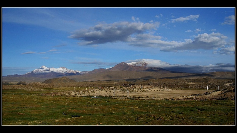 Další fotka z NP Lauca. Približně v jeho středu je vesnice Parinacota,která se nachází na náhorní plošině v 4 300 m.n.m. Tento kousek ploché půdy je dokola obklopen 5 a 6 tisícovkami,kdy šestitisícovky jsou všechno sopky. Příroda je zde člověkem naprosto nedotčená a působí přímo panensky. I přesto člověk čas od času najde známky civilizace, třeba toto fotbalové hřiště :). Sice jsem místní přeborníky neviděl, ale určitě bych si na jejich hřišti na ně vsadil, ikdyby hráli proti "kanárkům". Přeci jenom běhat v takové výšce dá málo kdo :).