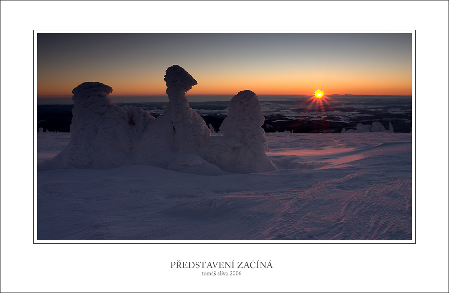 Z dnešního 10 hodinového výletu na sněžnicích v okolí Pradědu. Je úžasné vidět jak začíná den, vidět sníh zbarvený domodra sluncem které ještě nemá tu sílu. Já na to mám svoje pořekadlo: Tohle doma z gauče neuvidíte! Ta fotka to totiž pouze přiblíží, ale tu sílu okamžiku a požitku z něj nepředá, to nejde. Jo a v tom slunci někde stojí Marian Matta, tam jsou Beskydy.