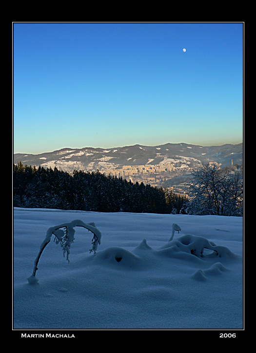 slunce ještě nezapadlo, ale měsíc už shlíží na valašské kopečky z pěkné výšky:)