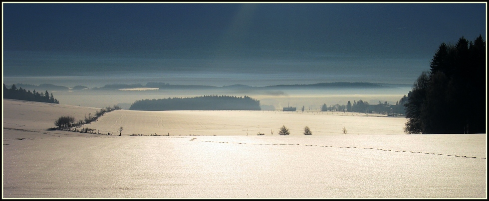Po ránu mrzlo, jen praštělo. V pozadí, v mrazovém oparu je vesnice na jihlavsku