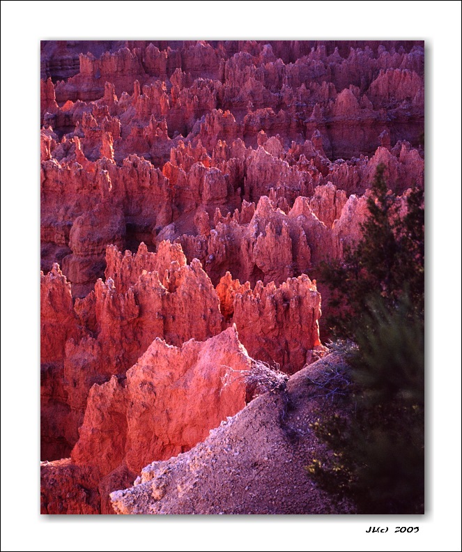 Pohled na skály v Bryce Canyonu, jež jsou osvíceny odraženým světlem od okolních načervenalých skal. Tím získávají charakteristickou lososovou barvu.