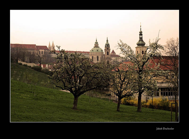 Petřín loňského jara. Fotil jsem v podvečer na clonové číslo 2.8, zaostřeno na stromy v popředí. Snímek jsem upravil do teplých tónů filtrem 81B. Byla to moje první procházka s novým objektivem nikkor 50/1.8D. Předtím jsem ještě fotil z rozhledny, ale to ještě záklaďákem, nikkor 18-70/3.5-4.5. Potom se setmělo a tak jsem část cesty z Petřína fotil jen padesátkou.