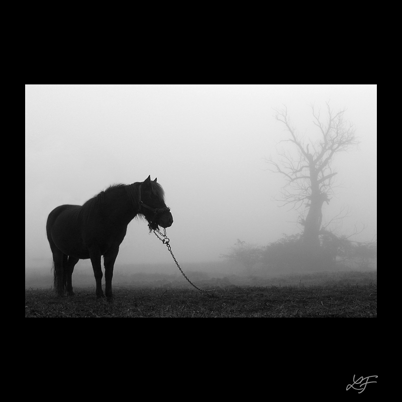 Kompozice 7+++, výborně rozvržené objekty...samotný postoj koně, řetěz...strom v mlze! Jen tak dál, opravdu chválím!!!