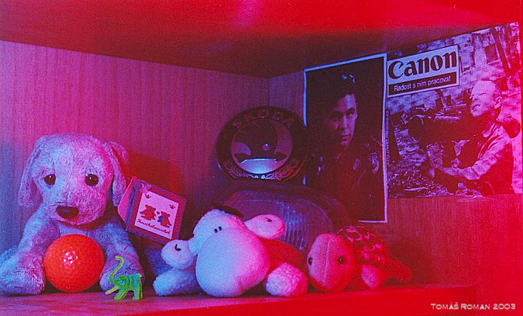 Tak takhle vypadá polička nad mým stolem, pro všechny příznivce firmy Canon je tam taková malá reklama(fotím výhradně s Canonem). Ten človíček vedle je Lister ze seriálu Red Dwarf, znáček je z vozu Škoda Felicia(naší), plyšáky jsem dostal darem a světlo za nimi je z Hondy Prelude(funkční) z nehody s tramvají...