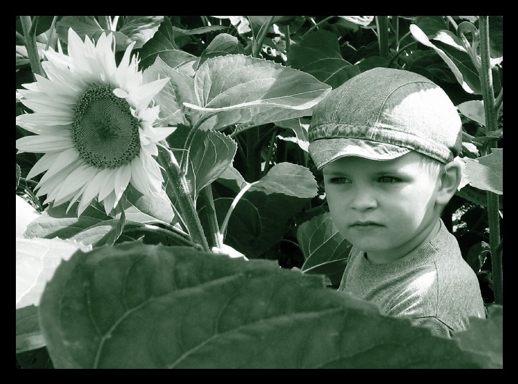 já bych nechal původní barvy... slunečnice jsou přece tak krásné... a to "sluníčko" jak říkáš, by to oživilo... jinak bych to zleva taky míň říznul