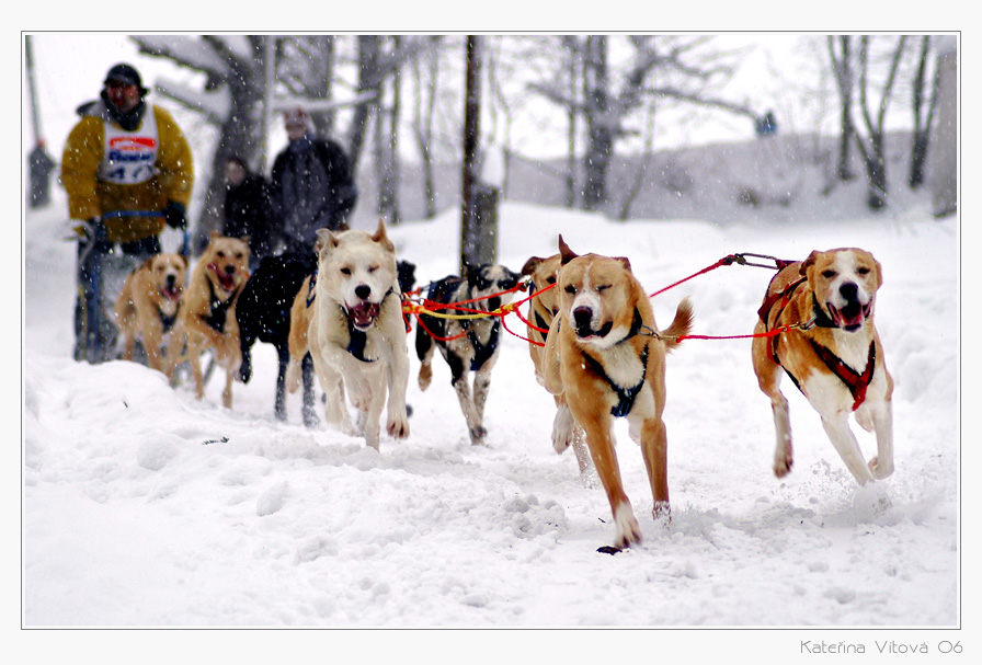 sice trošku out fotka, ale je pěkně zachycen ten akční náboj psího spřežení, trošku si pohrát s křivkami by pomohlo, zářící bílé je moc :-)
