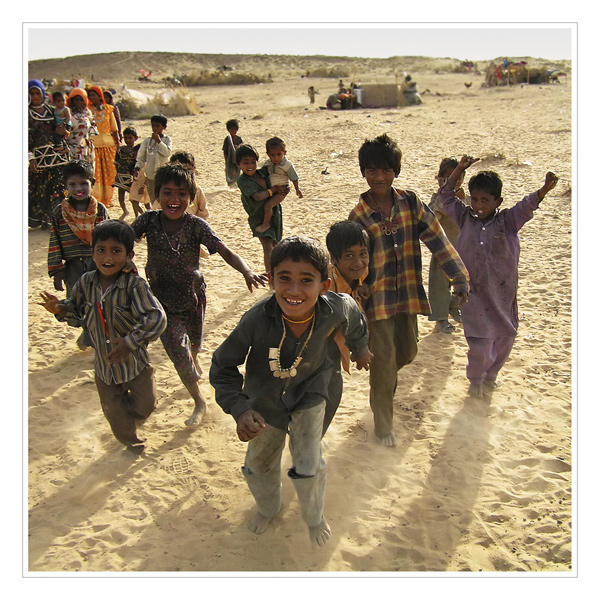 Takhle mě vítal v poustni vesnicce mistni cikansky kmen (poust Thar, Indie).